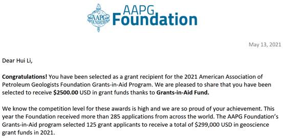 近日,美国石油地质学家协会(AAPG)官网公布了2021年度AAPG全球助研基金获得者名单,永利集团地质资源与地质工程2017级博士研究生李辉入选,获2500美元资助。