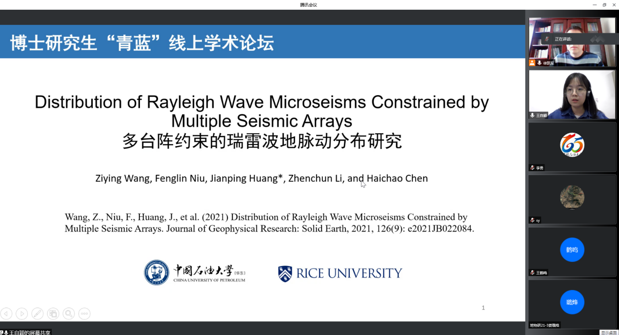 为进一步活跃研究生学术氛围,提高博士研究生的学术报告能力,在学校研究生院的大力支持下,博士研究生“青蓝”线上学术论坛永利官网分论坛于4月8日下午正式开讲,报告均采用腾讯会议线上形式进行,会议由地球物理系副主任徐凯军副教授主持,来自学校的各级博士和硕士生共80余人参与交流。