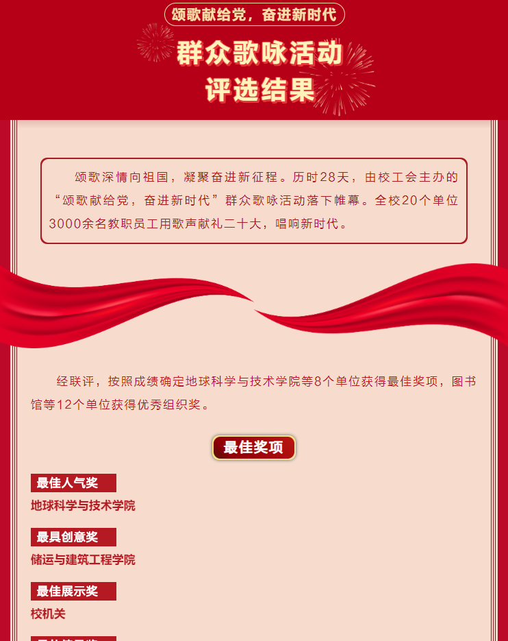 据悉,“颂歌献给党,奋进新时代”群众歌咏活动历时28天,全校20个单位3000余名教职员工用歌声献礼二十大,唱响新时代。活动评选出8个单位获最佳奖项,12个单位获优秀组织单位。