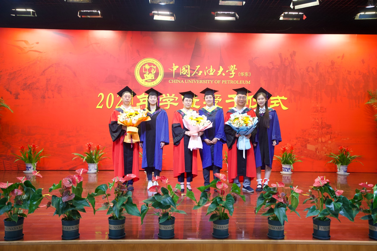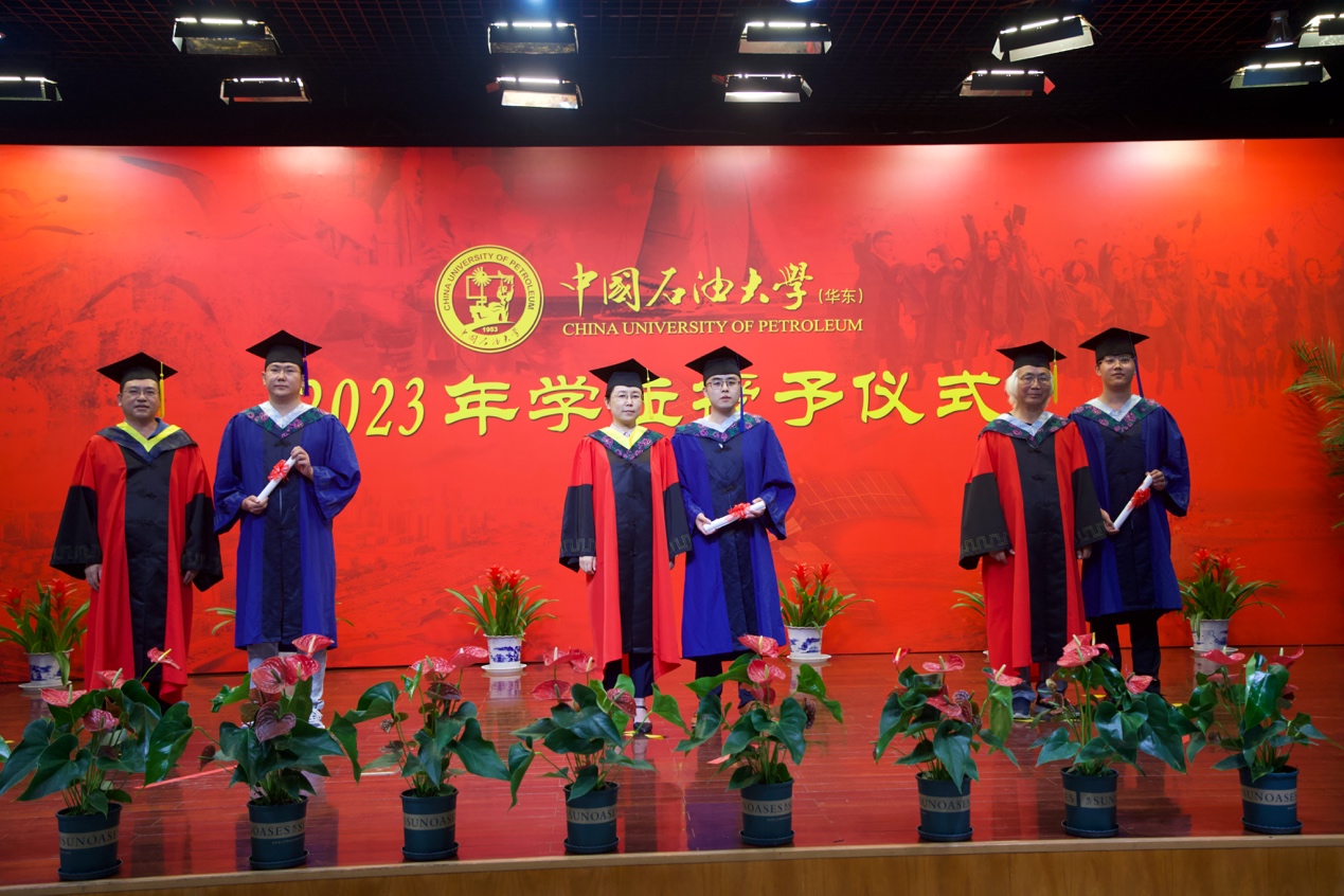 学位授予仪式上,刘华教授、范宜仁教授、周瑶琪教授、邓少贵教授共同为获得学位的毕业生颁发学位证书,拨正流苏,并合影留念。