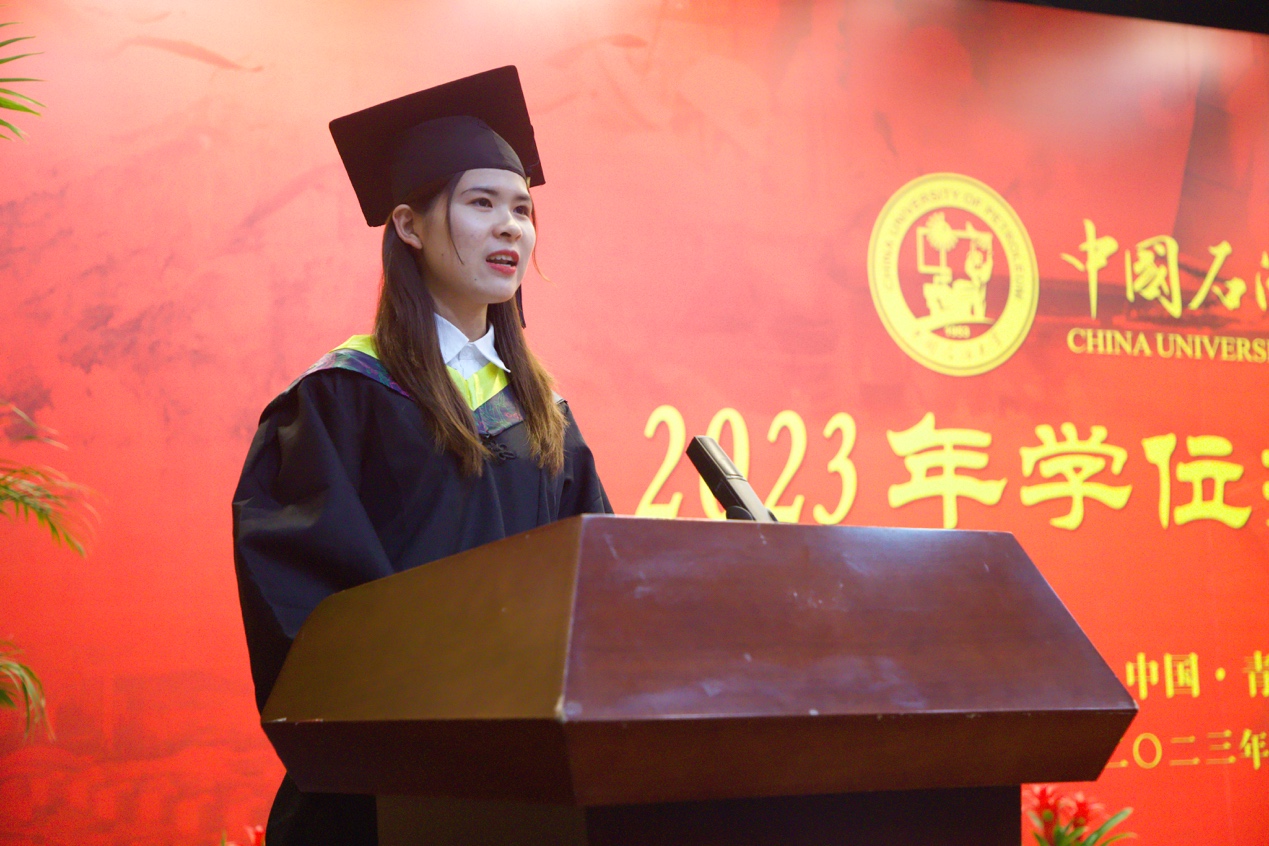 “四年前的我们从四面八方而来,四年后的现在我们即将去往五湖四海。不论是踏入社会工作,还是继续求学深造,我们都不会忘记在石大、在永利官网的所学所感。让时间作证,我们承载着学院领导、老师们的殷殷期盼与深情嘱托,一定牢记‘惟真惟实’的石大校训,不忘‘脚踏实地,胸怀全球’的院训,勤勉善学,追求卓越,立志为祖国能源事业的发展争雄、争气、争光!”本科生代表、本研地学1901班韩晓在发言中表示。