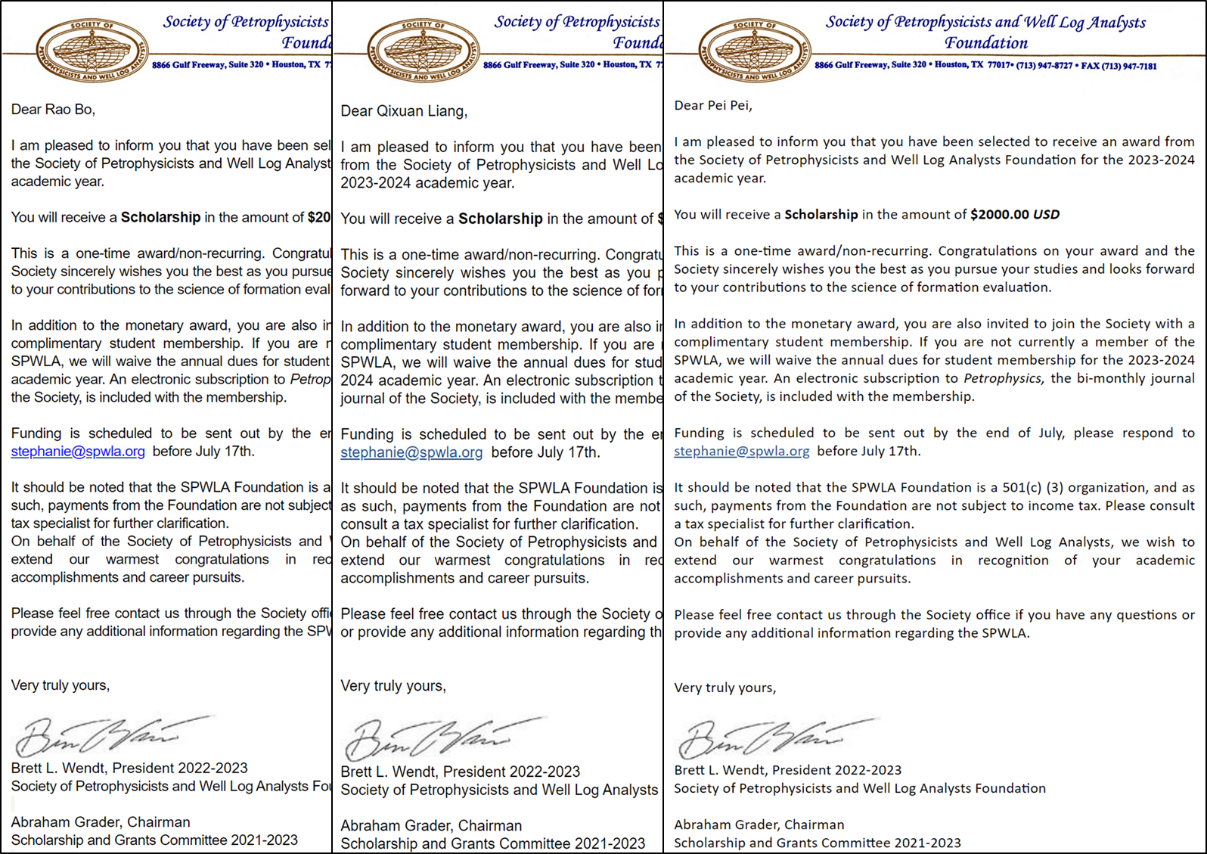 近日,经过国际岩石物理学家和测井分析家学会(Society of Petrophysicists and Well Log Analysts,SPWLA)评定,永利集团测井系博士研究生饶博、梁启轩和硕士研究生裴培3人获得2023年度SPWLA学生奖学金,奖金为每人2000美元。指导教师分别为苏远大教授、张锋教授和邓少贵教授。
