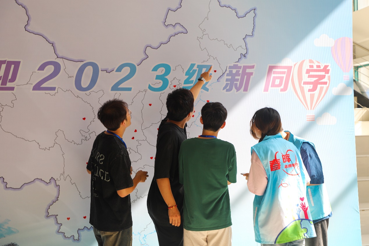 迎新现场为新生设置了许多互动体验类项目,帮助新生深入了解学院,明确未来的学涯规划。其中,“青春信箱”——给步入大学自己的一封信活动受到了新同学们的一致好评。在报到前,新生们都在纸上写下了自己下一个阶段的规划,与上大学后的自己来一次穿越时空的直面。朱家舒在纸上写到:“未来我会不断学习,深入开发自己的兴趣爱好,好好规划自己的未来,找到自己的发展方向。”经过评选,张硕宣作为获奖者获得了一份“携石问路”精美礼品。此外,在大厅中间,还摆放着一块带有中国地图的宣传板,新生们在“赤诚的心”贴纸上写下自己的名字,贴到地图上家乡的位置,“五湖四海相聚石大,携手并进从‘新’出发!”