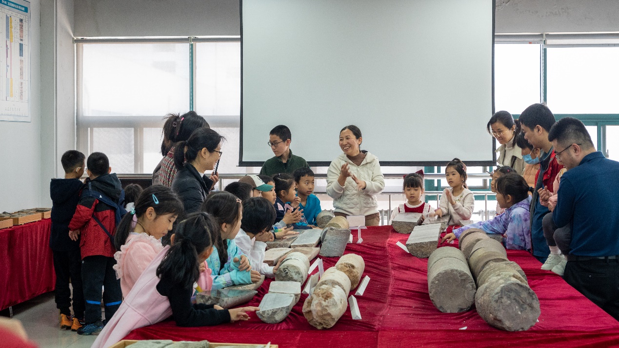 在岩心观察环节,“小科学家”们仔细观察了不同地层岩心的特征,并认真思考、积极提问,和父母一起讨论。随后在于老师指引下一起探寻了化石的印记,恐龙蛋化石、无盾龟化石等珍贵展品让他们惊叹不已。
