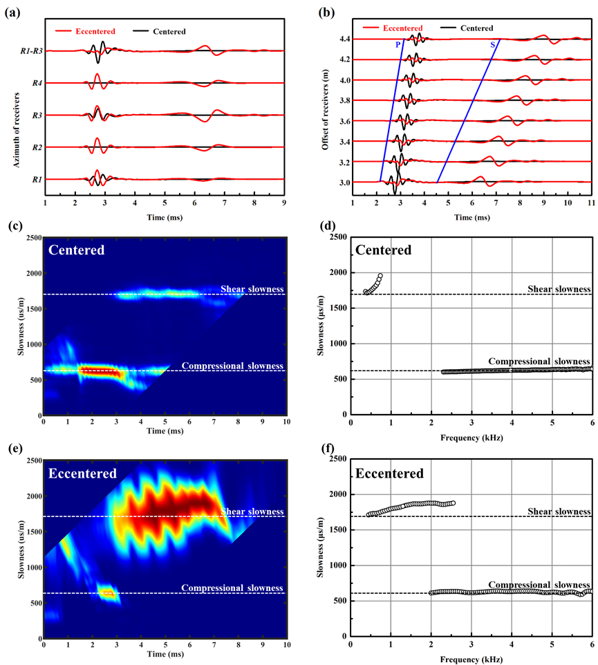 图1 传统和新型四分量偶极测量模式对比超软地层大井眼偶极测井建模. (a)源距3 m处的方位接收响应(黑线:居中测井;红线:偏心测井),同时给出了x方向偶极测量结果R1-R3;(b)居中(黑色)与偏心(红色)测井的阵列波形;(c和d)处理居中情况下阵列波形所得的STC图(时间慢度相关图)和SFC图(频率慢度相关图);(e和f)处理偏心情况下阵列波形所得的STC图和SFC图.