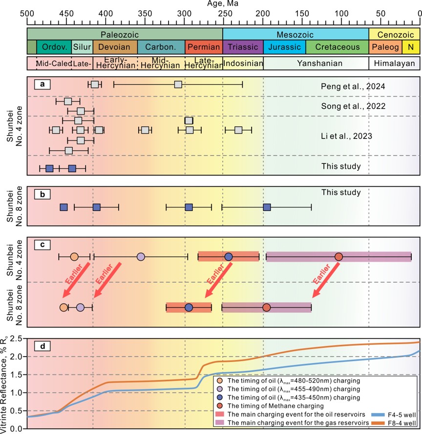 永利集团郝芳院士团队以顺北油气田两条主要走滑断层(顺北4号和顺北8号走滑断层)为研究对象,通过方解石脉的U-Pb定年确定走滑断层活动的绝对时间,并重建构造历史;在U-Pb地质年代学框架内,通过流体包裹体分析建立多阶段油气充注的年代学;通过综合地球化学和时间分析,识别主要的聚集事件。通过阐明断层激活与油气迁移之间的时空关系,量化了关键时期的成藏因素,重建了不同走滑系统之间的差异聚集过程,以及推进了对超深层、受断层控制的环境中油气富集机制的理解。