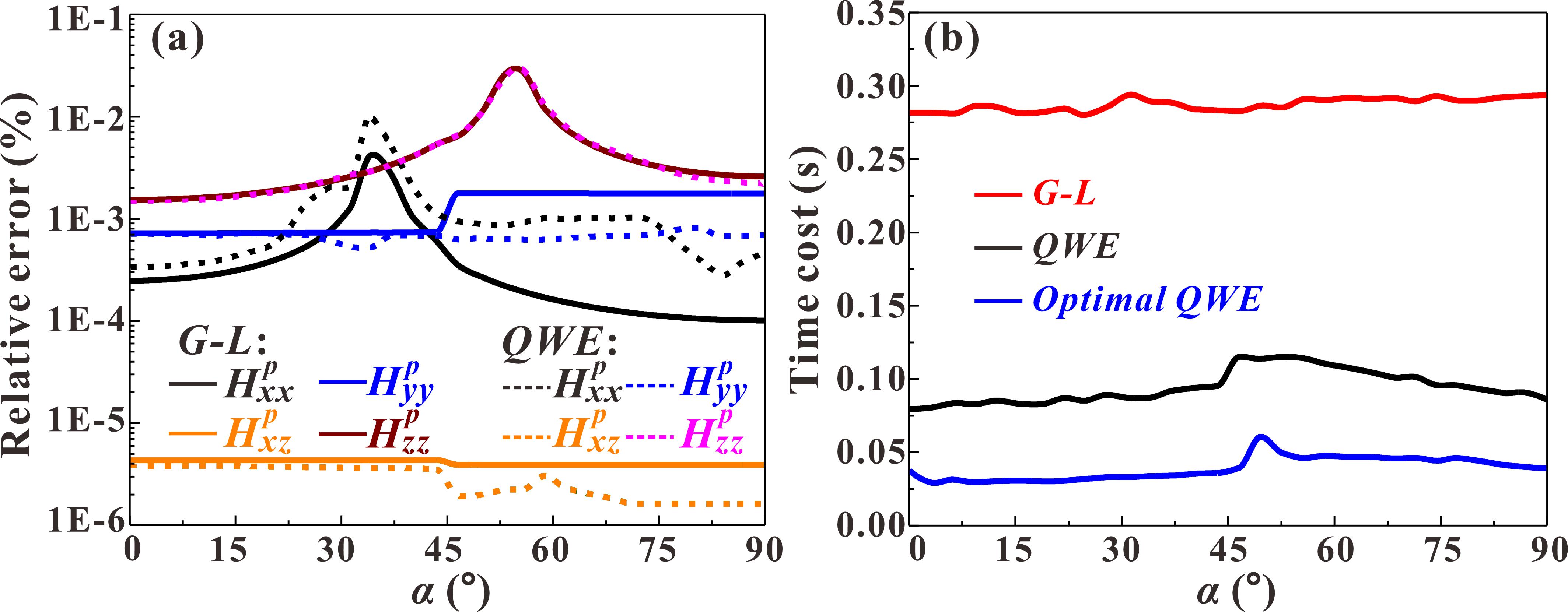 图3 外推积分(QWE)与Gauss-Legendre积分计算效果对比:(a) 精度对比;(b) 速度对比