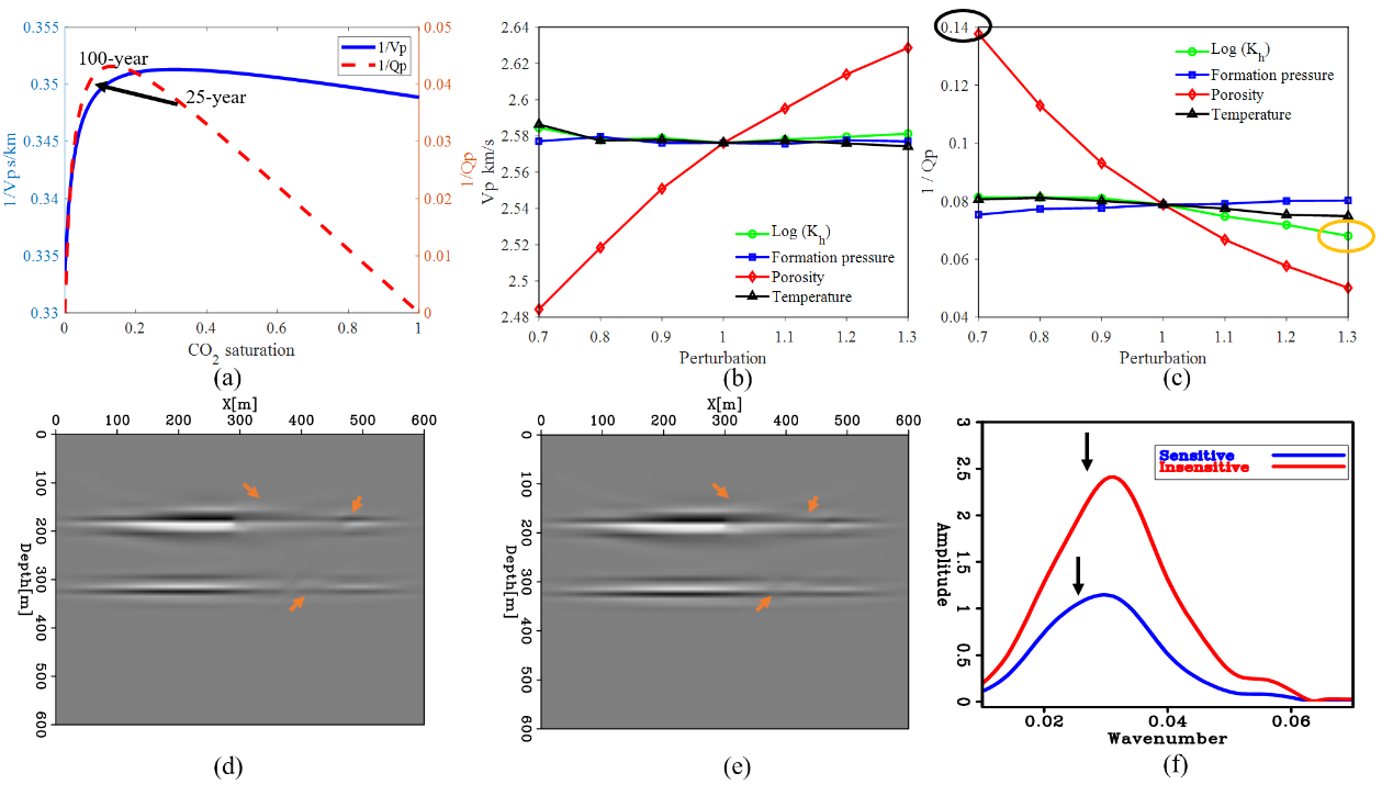图1.(a) CO2饱和度与1/Vp及1/Qp之间的关系;(b) Vp和(c) 1/Qp对影响因素的敏感性; (d) 对速度、衰减敏感的岩石物理参数逆时偏移成像结果;(e) 对速度、衰减不敏感的岩石物理参数逆时偏移成像结果;(f) 敏感与不敏感参数的频谱变化