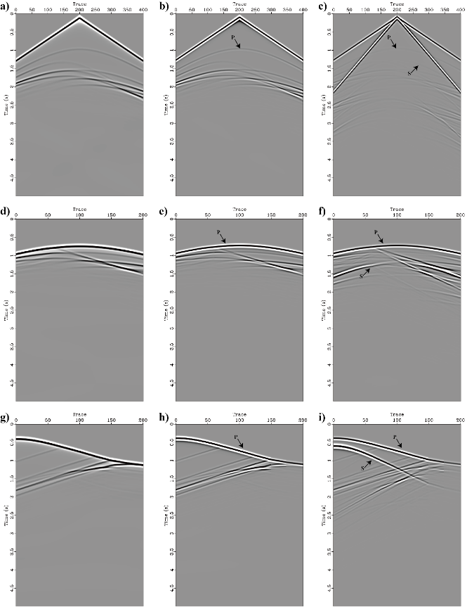 图2.断层模型模拟螺旋光纤炮集,第一行检波点位于地表,其中(a)为传统速度压力分量,(b)和(c)分别为35.3°和54.7°的轴向应变率;第二行检波点位于水平井,其中(d)为传统速度压力分量,(e)和(f)分别为35.3°和54.7°的轴向应变率;第三行检波点位于垂直井,其中(g)为传统速度压力分量,(h)和(i)分别为35.3°和54.7°的轴向应变率