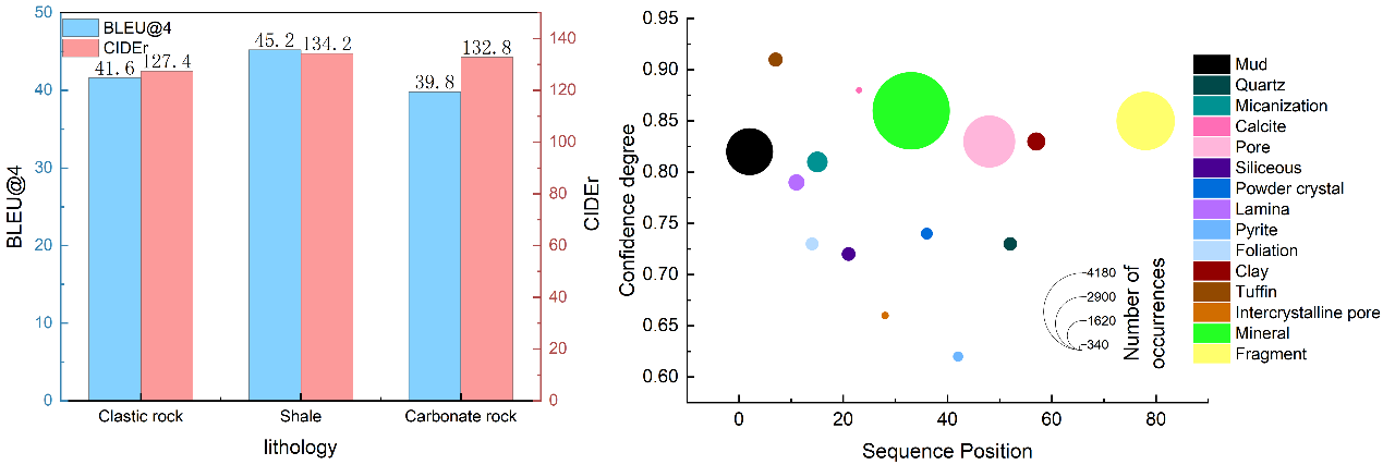 为开展岩性为沉积岩的岩石薄片智能鉴定任务,本研究共收集了岩性类型分别为碎屑岩、页岩及碳酸盐岩的薄片图像及鉴定文本数据。实验结果表明:ThinGPT模型生成的碎屑岩、页岩和碳酸盐岩薄片鉴定结果具备合理的上下文关系并符合真实样本风格(图2-4),在指标评估上具有潜在性能。在模型复杂度上,仅训练映射网络的ThinGPT模型更加轻量化,极大提高了薄片鉴定效率,实现了视觉和文本预训练大模型的语义联合表示(图5)。