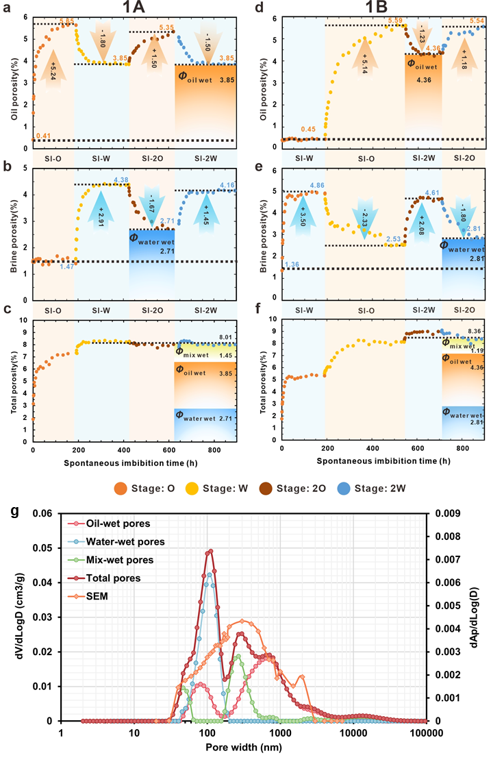 其中,SI-O和SI-W阶段为流体充填阶段,页岩孔隙快速被油和水充填;SI-2O和SI-2W阶段为流体平衡置换阶段,页岩孔隙中总流体含量不再发生变化,而混合润湿孔隙中的流体则随渗吸流体类型的变化而发生置换。基于页岩孔隙润湿性差异,本研究构建了页岩交替自发渗吸模型,并通过T2核磁共振分析和流体含量变化验证了模型的准确性。基于该模型,定量分析了页岩中三类不同润湿类型孔隙的含量,并从不同状态下的T1-T2谱中剥离出不同润湿类型孔隙的T2谱,结合T2谱的孔径分析进一步明确其孔径分布。本研究方法建立了一套针对复杂润湿性多孔介质的孔隙尺度润湿性定量评价的方法体系,弥补了页岩等致密储层中不同润湿类型孔隙定量和孔径分析的空白,为非常规油气开采、CO2强化驱油及地质封存、地质储氢以及地下水回填等工程地质问题提供了孔隙润湿性评价的关键参数。