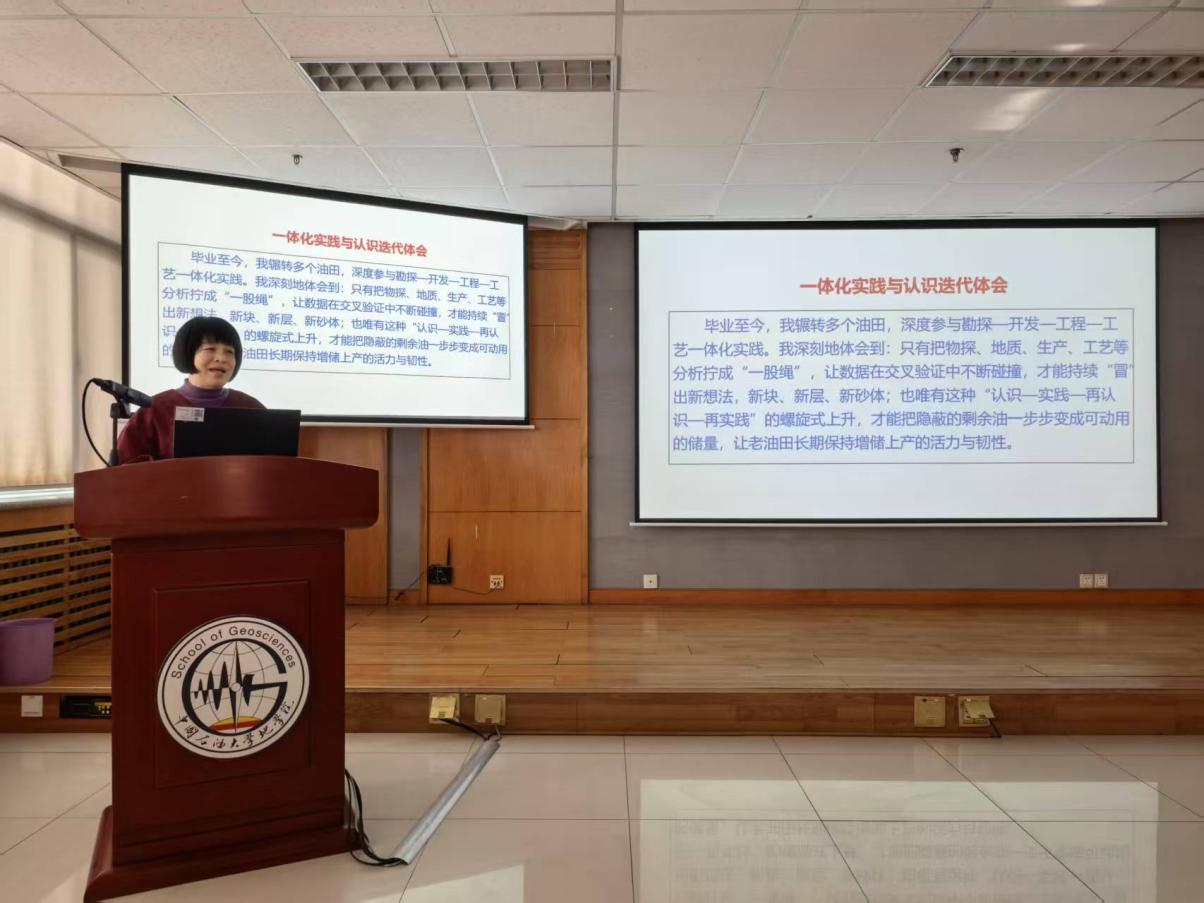 李雪以八面河地区滚动勘探实践、海安地区某油田增储挖潜为案例,在报告中系统介绍了老油田隐蔽油藏的地质成因、分布规律与勘探技术。她从储层沉积特征、成藏机理出发,深入剖析了隐蔽油藏与常规油藏的核心差异,重点阐述了“地质再认识” 理念下的地质模式指导、储层精细描述技术、油藏边界识别方法及储量评估模型等。报告以制约老油田发展的储量问题为切入点,基于老井复查等精细解剖,思路-认识-技术并行,并使用“金字塔原理”的讲述方式,详细讲解了如何利用现有资料大胆假设、仔细求证的工作理念,为现场师生提供了如何从地震、测井到沉积相分析等,最终实现储量增长的关键技术支撑和实践指导。此次分享紧密对接师生聚焦于一点而不观全貌的学习工作特点,对推动地质工程一体化分析以及日常工作学习都具有重要的现实意义。