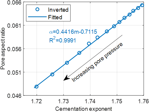 图2. 孔隙压力诱导的岩石孔隙度变化为隐含函数时,胶结指数与孔隙纵横比的相关性及其最佳拟合线性曲线