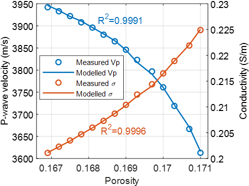 图3.基于建立的胶结指数与孔隙纵横比之间的关系,分别利用胶结指数和孔隙纵横比计算得到纵波速度与电导率的模拟值,并将其与实测纵波速度和电导率进行对比的结果