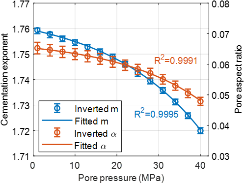 图1. 孔隙压力诱导孔隙度变化时,反演得到的胶结指数与孔隙纵横比的变化情况,以及二者的最佳拟合指数曲线