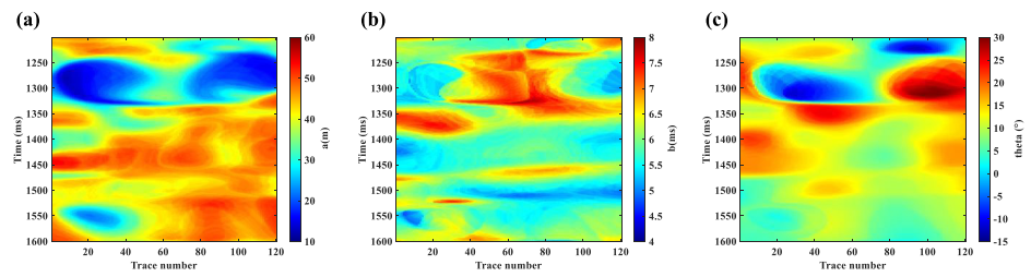 图2. 随机介质的自相关参数 (a)横向自相关长度;(b)纵向自相关长度;(c)自相关角度