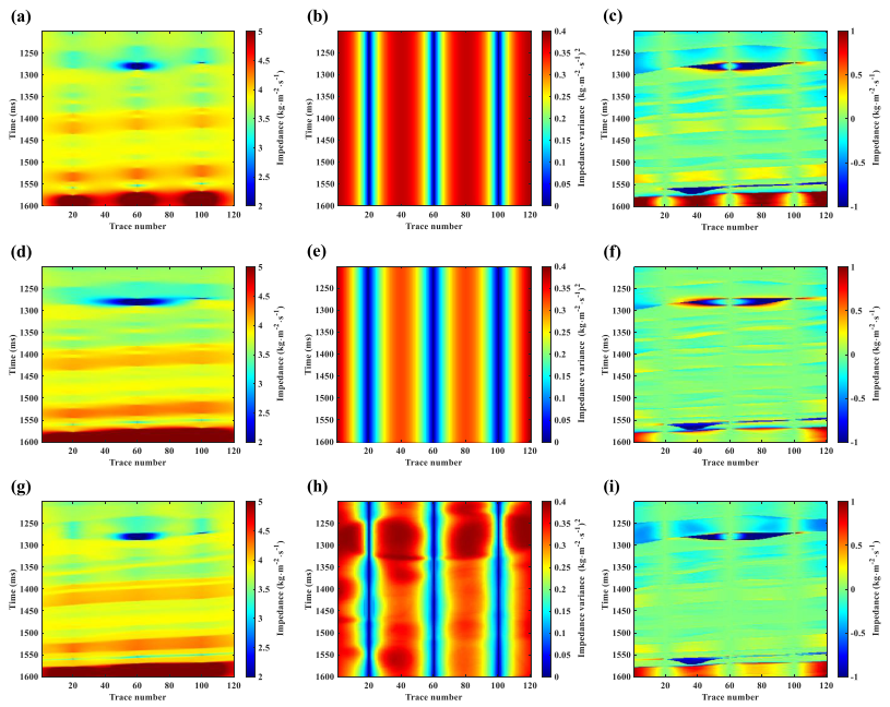 图3. 三口伪井的克里金插值 (a)-(c) 基于使用全局空间范围的各向同性克里格插值方法,分别显示克里金插值结果、方差和克里金插值结果与模型数据之间的误差;(d)-(f) 基于使用全局空间范围的各向异性克里金插值方法;(g)-(i) 基于随机介质统计特征参数的各向异性克里金插值方法