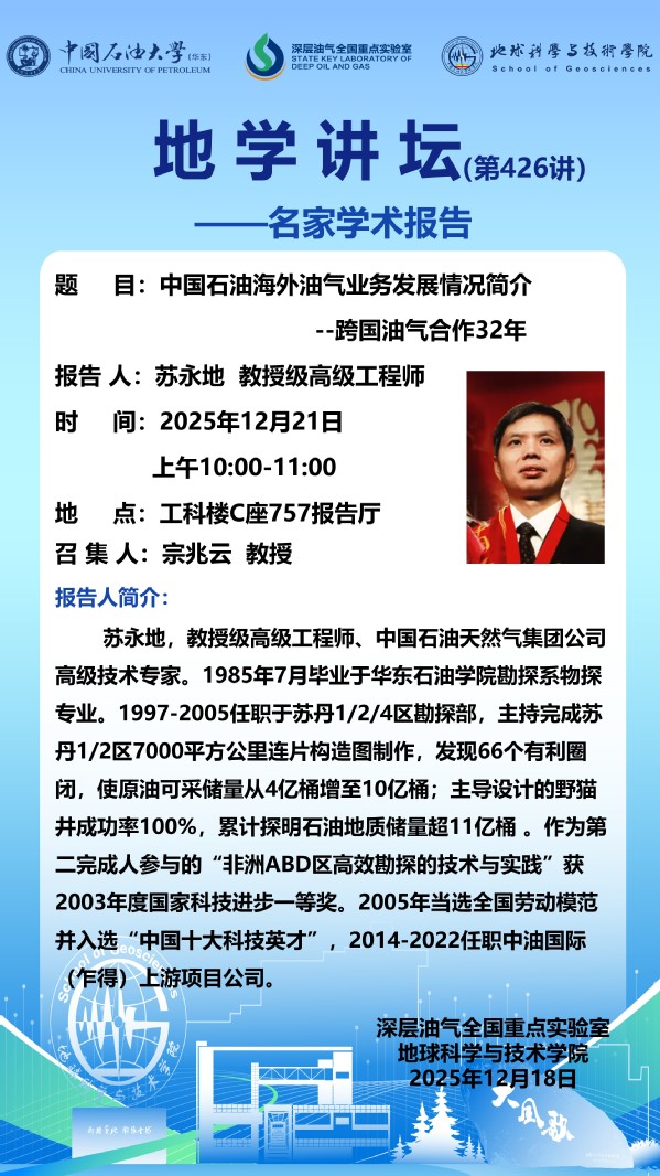 【地学讲坛第426讲】关于苏永地教授级高级工程师《中国石油海外油气业务发展情况简介--跨国油气合作32年》学术报告的通知