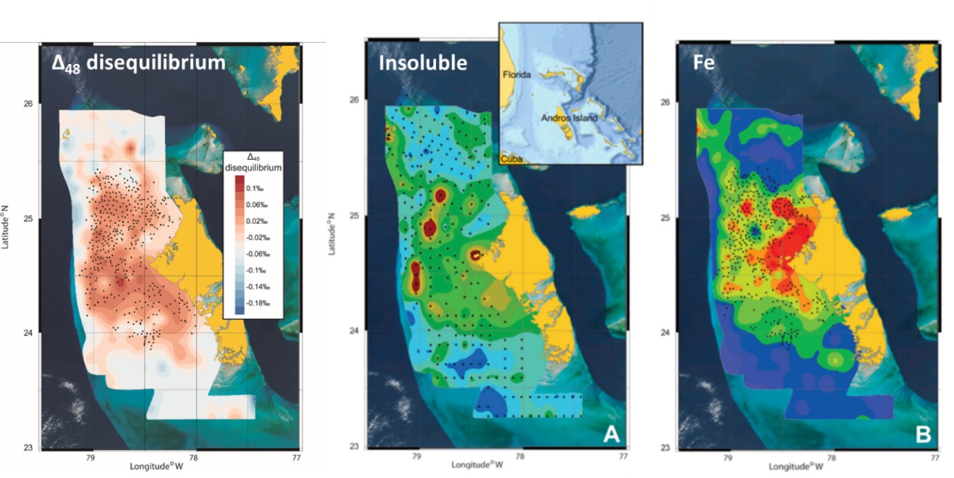 巴哈马灰泥岩(也称为“whitings”)的Δ48正偏移是浮游生物的光合作用引起的。巴哈马碳酸盐台地的灰泥岩成因存在较大争议,两种主要的成因假说均有可能引起团簇同位素的动力学效应。第一种假说认为,粉尘的“施肥效应”导致浅水浮游藻类光合作用增加,光合作用吸收水体中CO2,导致局部pH和饱和度升高,引起灰泥沉淀。第二种假说认为,台地边缘和斜坡富含溶解无机碳(DIC)的冰冷海水入侵台内温暖水体,引起CO2去气作用,导致pH和饱和度的升高。本研究发现灰泥的Δ48不平衡主要集中在台地内部,向台地边缘减弱,该分布特征难以用冰冷海水入侵成因解释。相反,Δ48不平衡的分布特征与不溶物含量和Fe含量分布特征一致,支持了粉尘携带的Fe元素促进光合作用,增强CO2的吸收,引起pH值升高和碳酸盐过饱和,该过程引起的Δ48的动力学效应被记录在灰泥沉积中(图2)。