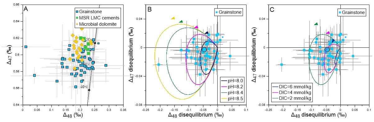图3(A)巴哈马颗粒岩Δ47和Δ48值与受到硫酸盐还原影响的白云石和方解石对比;(B)和(C)IsoDIC模型在不同pH和DIC浓度的模拟结果与巴哈马颗粒岩Δ47和Δ48不平衡对比