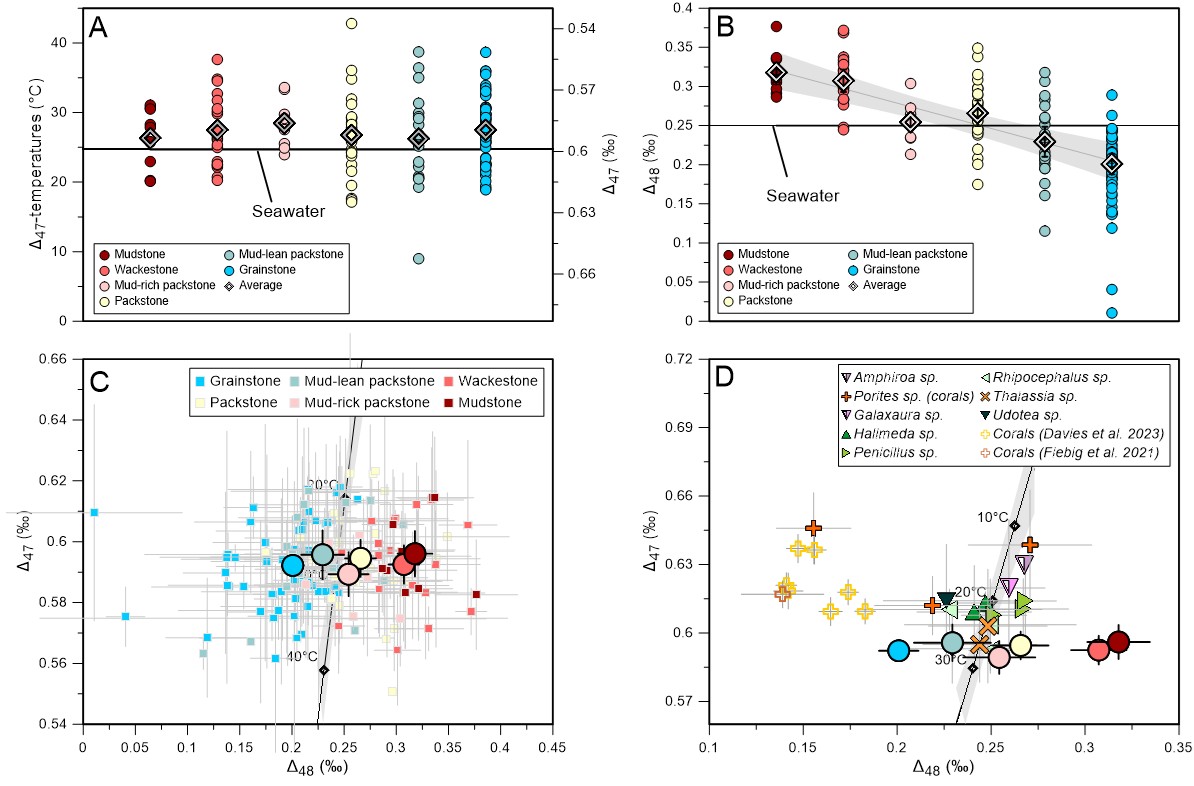 图1(A)巴哈马台地现代碳酸盐不同岩相的Δ47值;(B)巴哈马台地现代碳酸盐不同岩相的Δ48值;(C)巴哈马台地现代碳酸盐不同岩相的Δ47和Δ48与理论平衡值对比;(D)巴哈马台地现代碳酸盐不同岩相与骨架颗粒的Δ47和Δ48对比