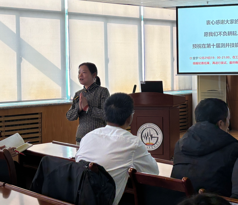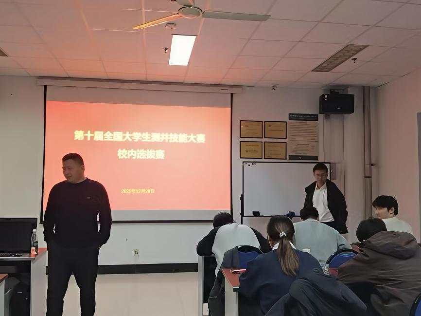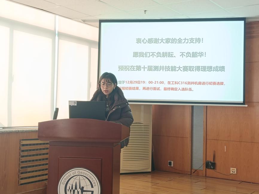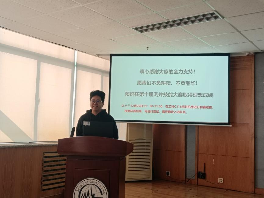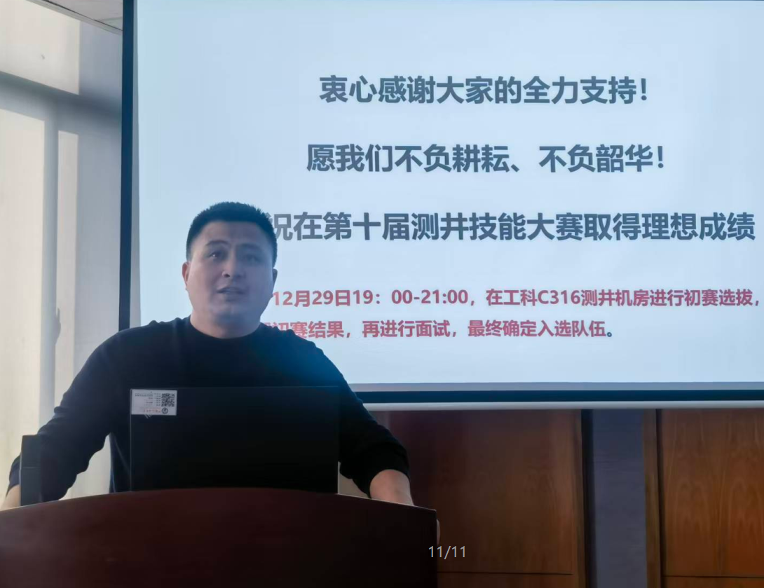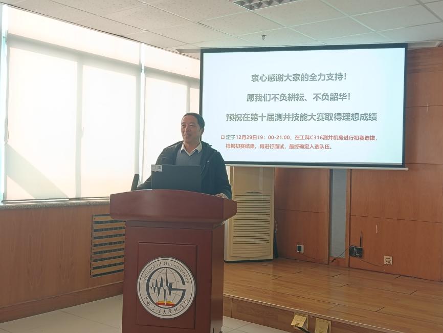2025年12月29日,第十届全国大学生测井技能大赛动员会在学院757报告厅顺利召开。测井系2022级本科生、2025级硕士生齐聚现场,张锋、邵才瑞、邓少贵、葛新民、张福明、张凯、王正楷、张绚华等多位教师莅临指导,动员会由系副主任肖佃师主持。