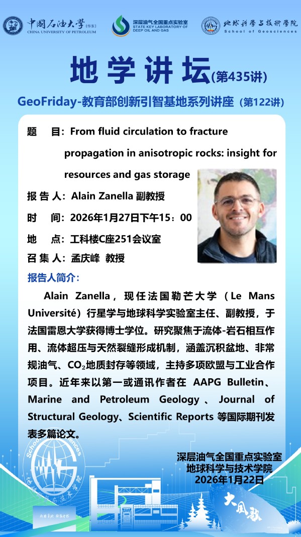 【地学讲坛第435讲】关于Alain Zanella 副教授《From fluid circulation to fracture propagation in anisotropic rocks: insight for resources and gas storage》学术报告的通知